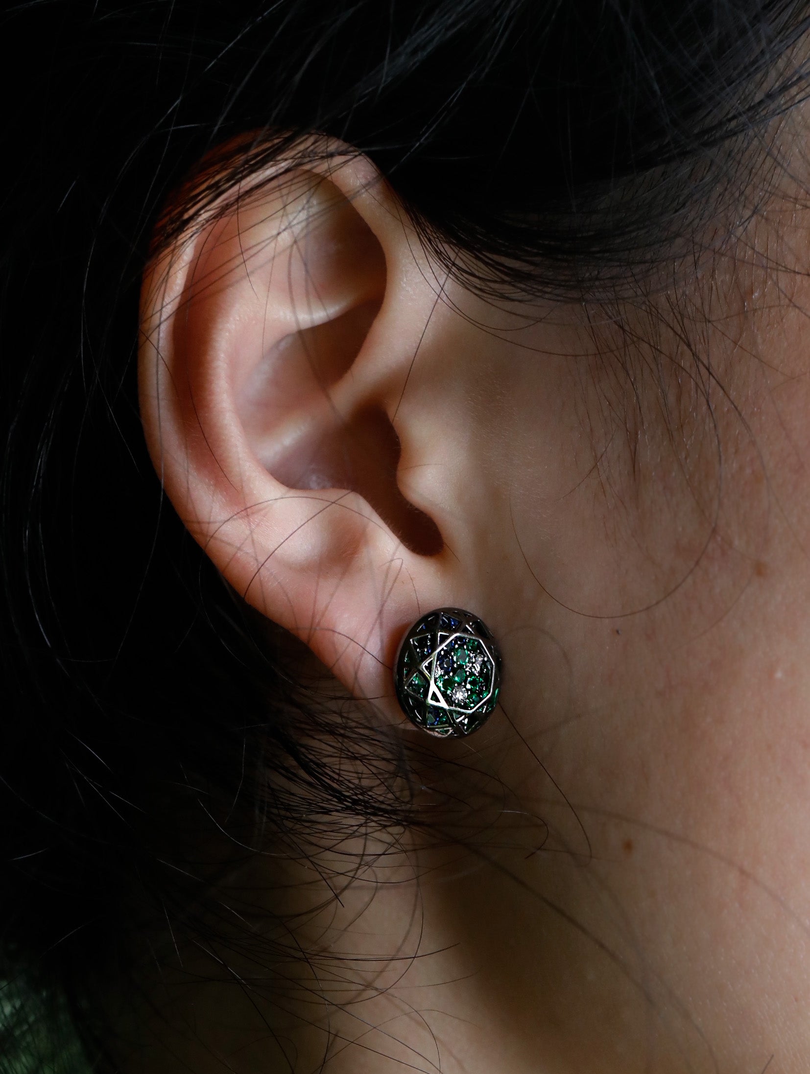 What happens if you deconstruct a jewel and reinterprets its inner radiance? This Mystic single earring features an exquisite arrangement of hand-selected sapphires, tsavorites, and diamonds, each chosen for their distinct hues and sizes, harmoniously set within the contours of a gemstone. This piece is crafted with solid black gold, a bold and elegant choice that adds a touch of mystery and sophistication, and provides a striking backdrop for the vibrant hues and brilliance of the gemstones. This portrayal mirrors the quiet beauty of nature, capturing the serene moments of growth and life within a tranquil and mysterious background.