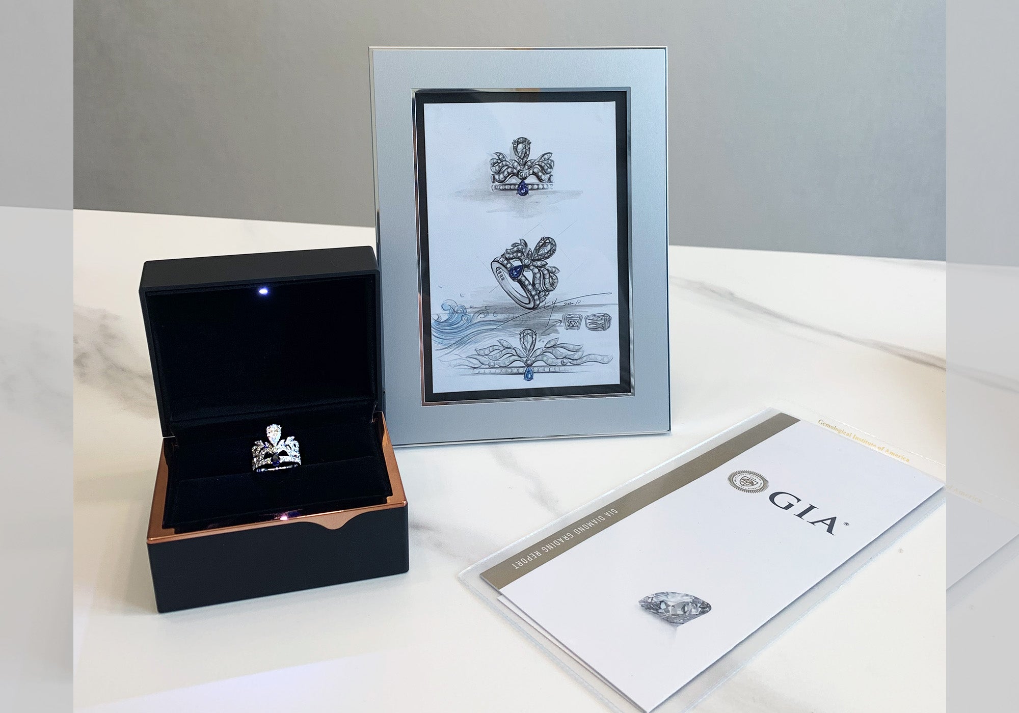 Once your custom ring is ready, we coordinate its delivery. Additionally, we'll schedule an appointment to discuss care and cleaning, provide relevant certifications for diamonds and gemstones, and cover topics such as ring insurance and shipping options to ensure your satisfaction with the entire process. For engagement rings, a specially crafted hand-sketched picture, tailored to narrate your unique story, will also be included.