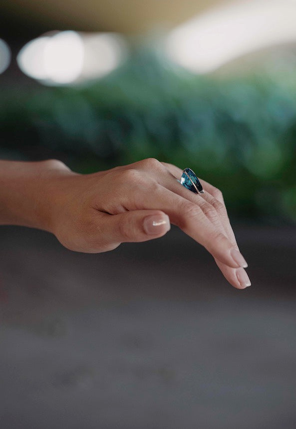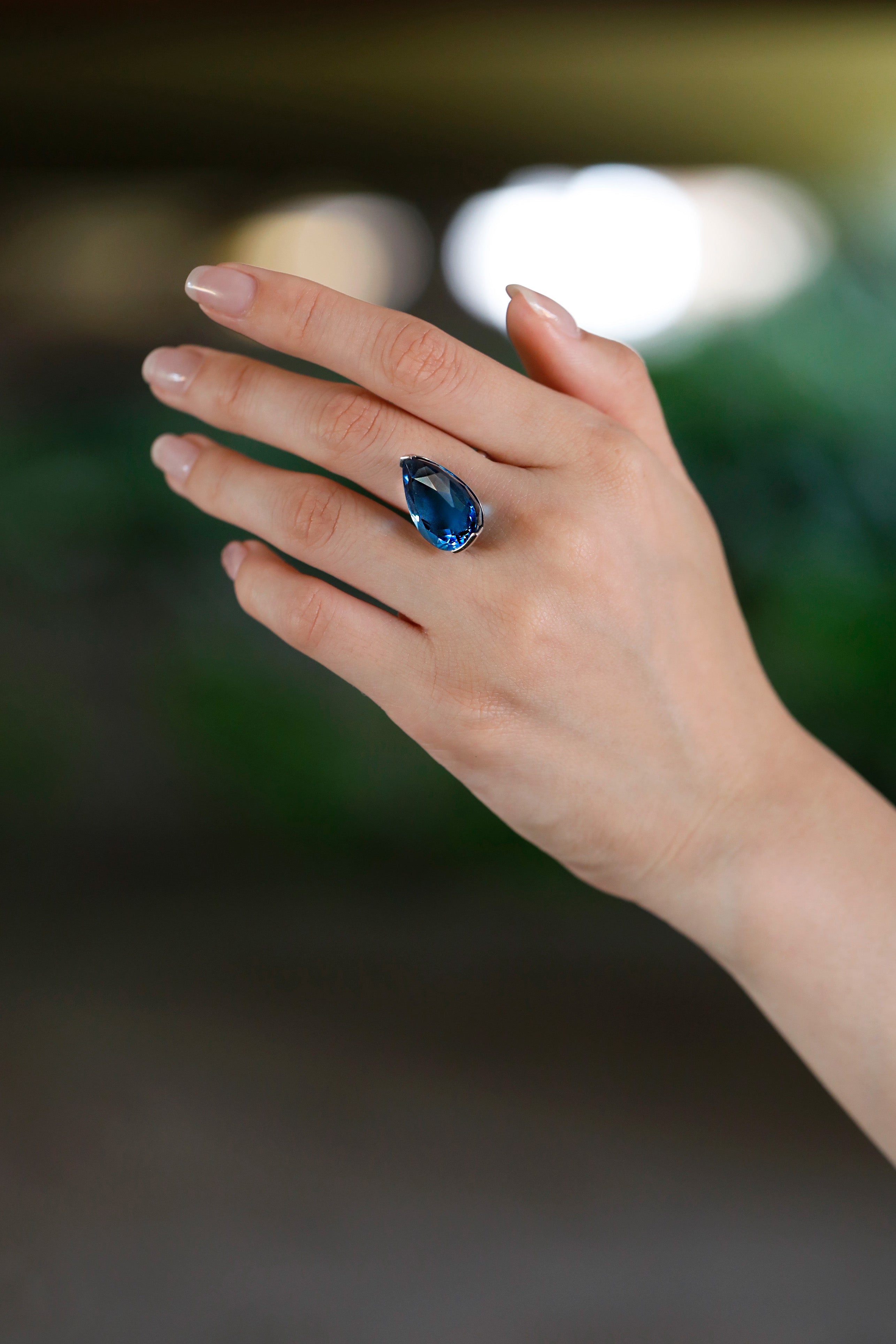 The Dreamscape designs attempt to push the traditional boundaries of jewelry presentation, and to explore the coexistence excitement and security. The signature design of this collection, this Dreamscape II ring features an oversized teardrop-shaped blue topaz in an unconventional, tilted arrangement. The center stone’s unusual positioning invokes a precarious illusion, as if it has just alighted on the wearer’s finger, suspended in a moment of graceful descent, and might teeter and fall with the slightest disturbance. Yet in reality, the ring is meticulously crafted to snugly embrace the wearer's finger, while minimizing the presence of the ring band to the best possible extent for the illusion of a floating gemstone. Beyond a free and unconstrained look, the center stone's placement and angle have carefully chosen to best exhibit its azure brilliance to the wearer.