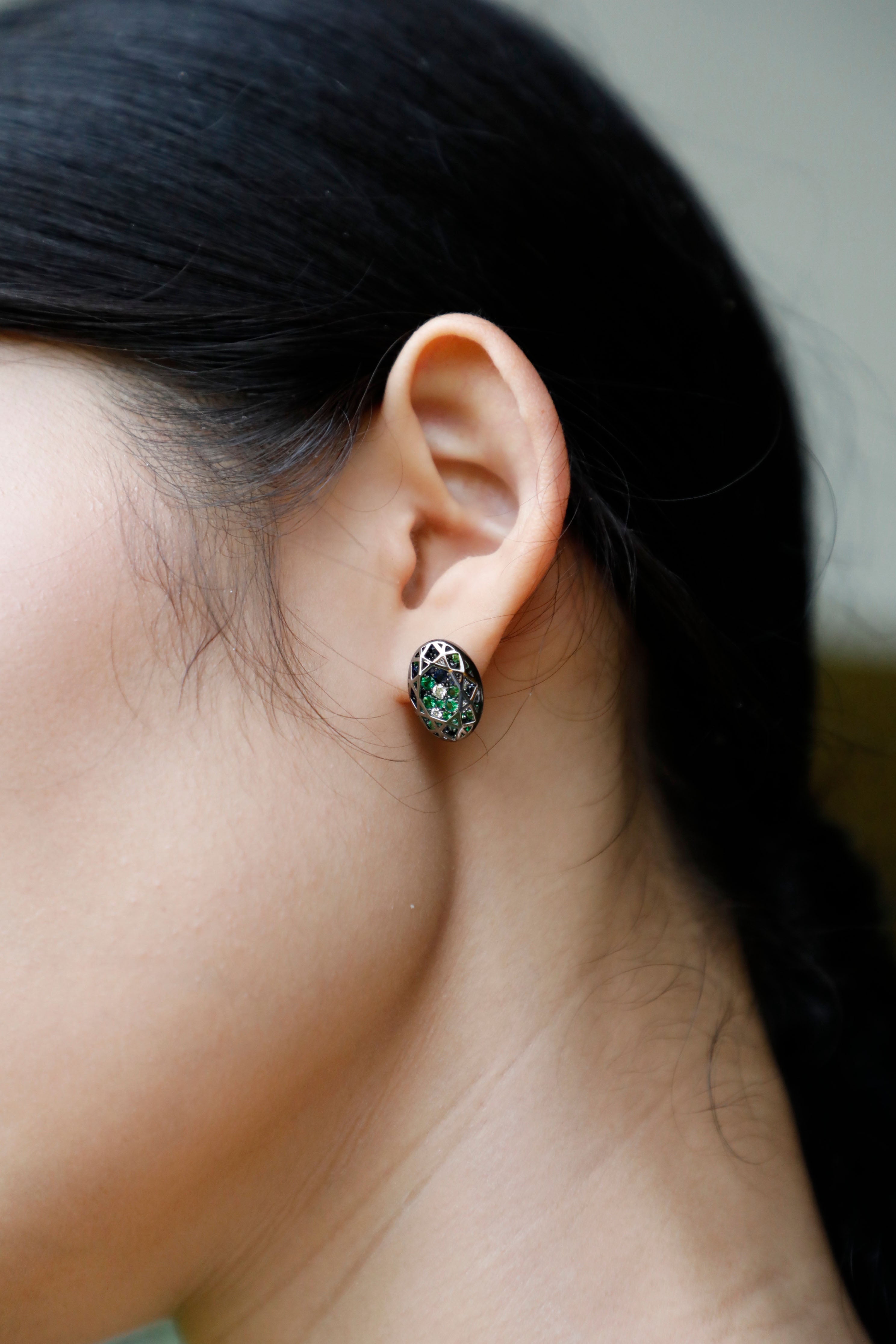 What happens if you deconstruct a jewel and reinterprets its inner radiance? This Mystic single earring features an exquisite arrangement of hand-selected sapphires, tsavorites, and diamonds, each chosen for their distinct hues and sizes, harmoniously set within the contours of a gemstone. This piece is crafted with solid black gold, a bold and elegant choice that adds a touch of mystery and sophistication, and provides a striking backdrop for the vibrant hues and brilliance of the gemstones. This portrayal mirrors the quiet beauty of nature, capturing the serene moments of growth and life within a tranquil and mysterious background.
