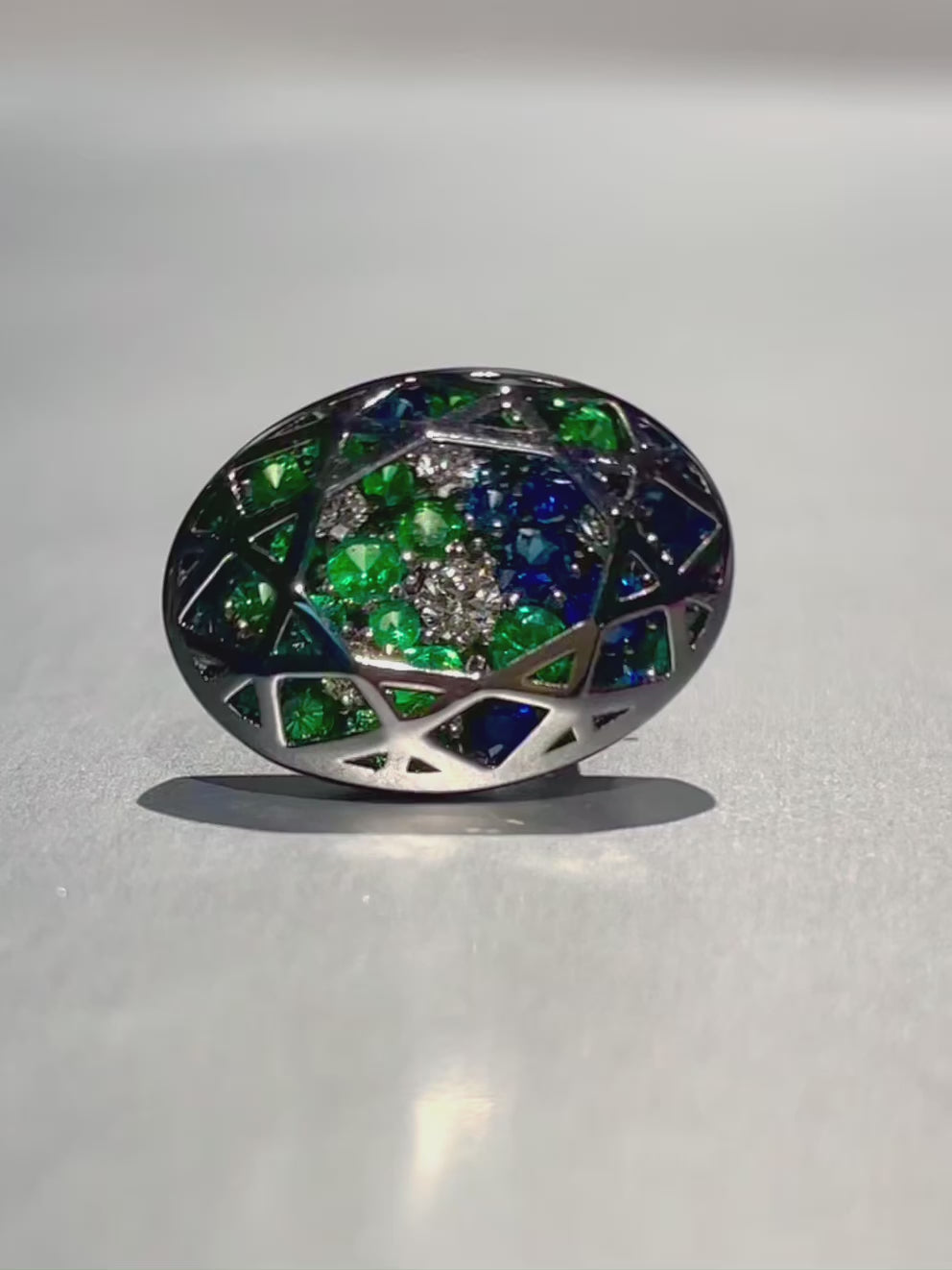 Pavé with tsavorites, sapphires, and diamonds.