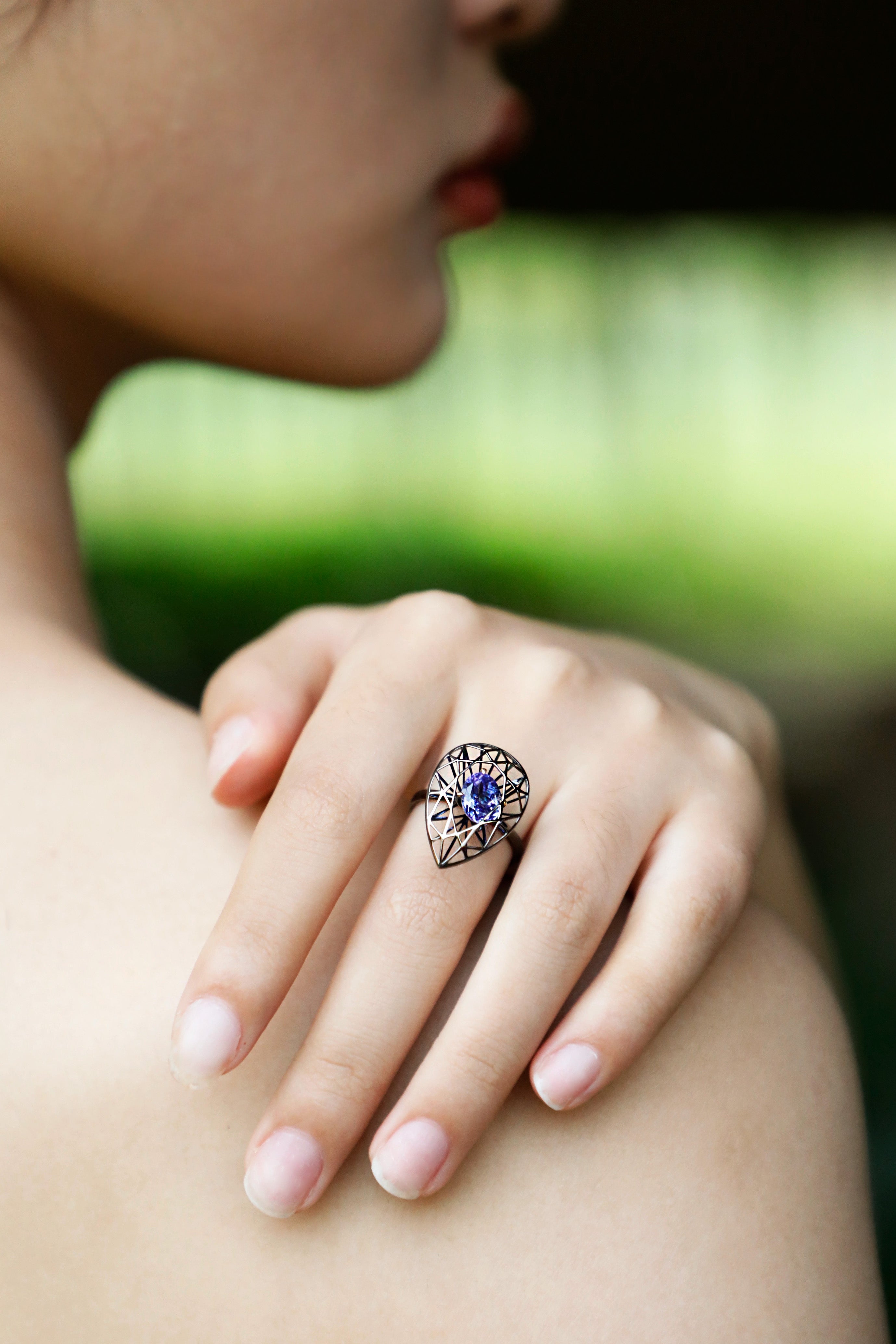 The Inner Dimensions Ring is inspired by the interplay of individuality's conflict and harmony with societal standards. A resplendent gemstone set in a dynamic tilt is cradled within a cage made with solid black gold that mirrors its own contours. At the same time, the cage, echoing the gem's silhouette, is a “gemstone” set in a traditional solitaire setting. Beyond its role in confinement, the cage also serves as a protective embrace, symbolizing the internal struggle between personal freedom and the societal pressures to conform.