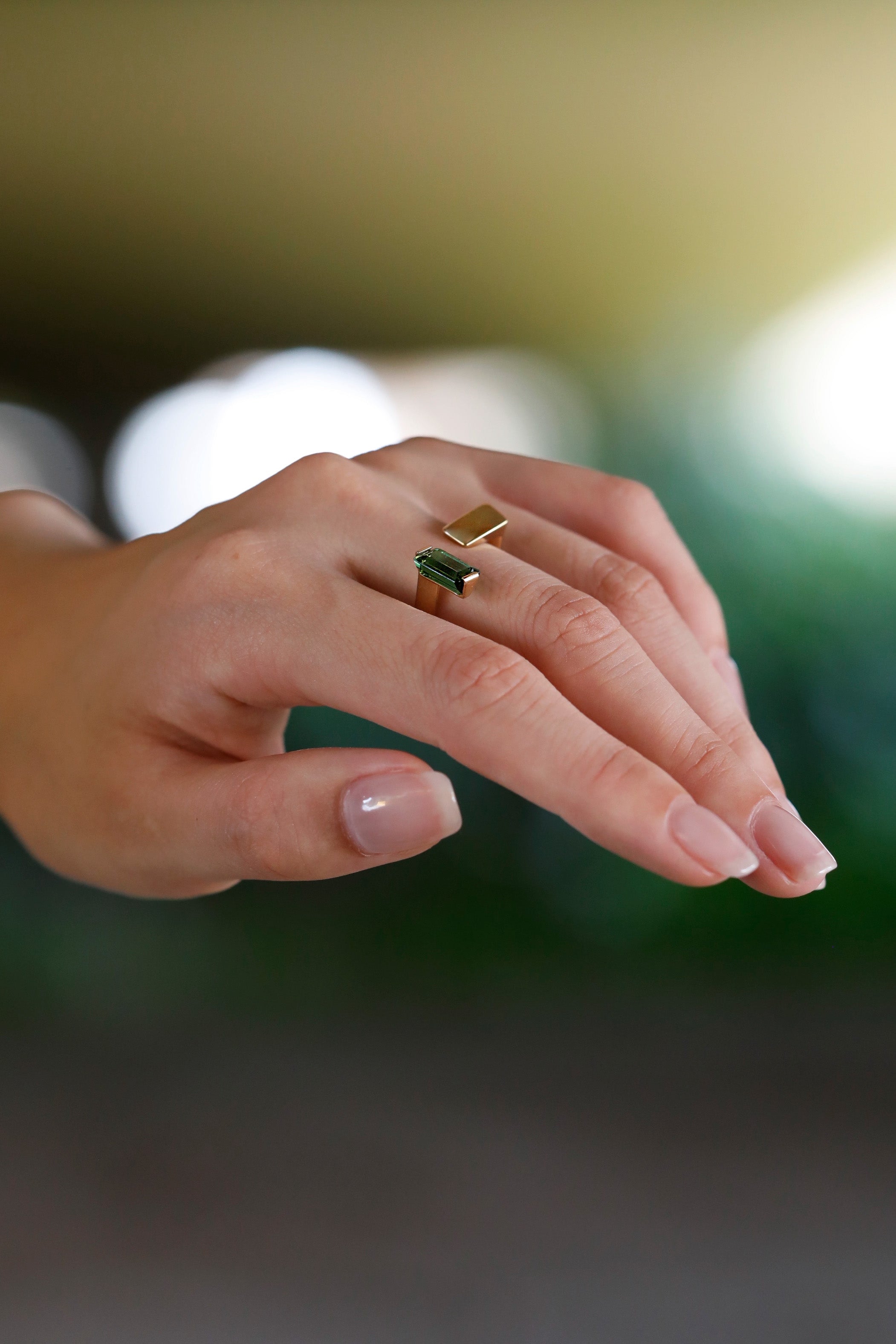 Inspired by the ethos of “Less is More”, the Phantom of Light collection beckons you into a realm of light and reflections, and invites an exploration of the quiet complexity arising from the arrangement of minimal elements. This ring features a striking geometric mirror surface, seamlessly flat and unembellished. Complementing this empty reflective surface is a gemstone in a minimalist setting, so that its brilliance takes center stage without distractions. The vacant mirror captures and reflects fleeting glimpses of the gemstone's radiance and the ever-shifting ambiance of its surroundings, creating an intangible poetry of light, shadow, and the ever-changing world that surrounds us.